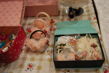 お嫁へ出す準備中、私のショボイカスタムやし、色々持たせてやりたいなと思い、家にあるブライス服の中から似合う服や小物を何着か持たせました。